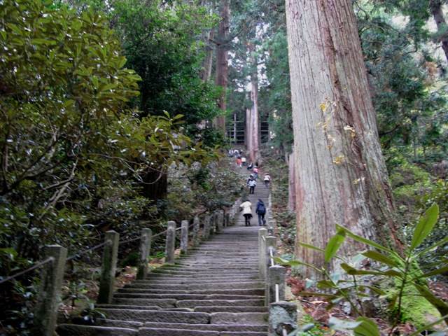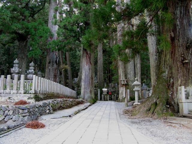 ここからが世界遺産の指定地、当時墓石の代りに植えられた杉がうっそうと林立する参道を行くと奥の院へ通じている。