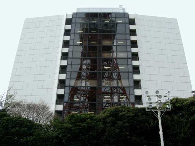C駐車場脇のビルに映るタワー
