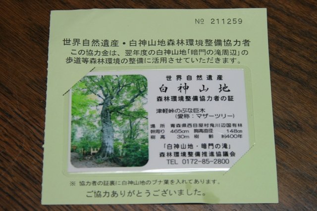 自然保護のために基金をするとわたされるカード、裏にはブナの葉が貼り付けてある。