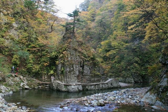 青森県西目屋の白神山地へのベースキャンプ「アクアグリーンビレッジ」からブナ林を40分ほど歩くと暗門川の川原にでる。