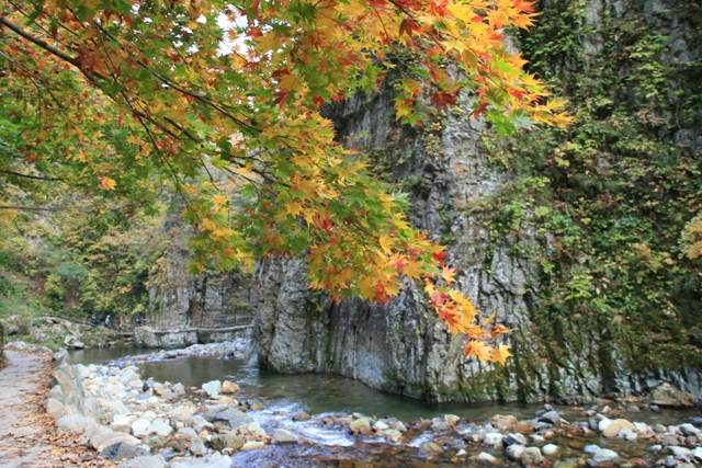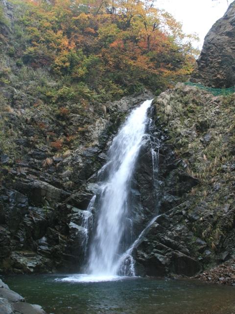 清流沿いに作られた細い遊歩道を30分ほど行くと川幅も狭くなって急な断崖に囲まれ、神秘的な雰囲気の中に3段からなる滝の一つ暗門第3の滝の前にでた。