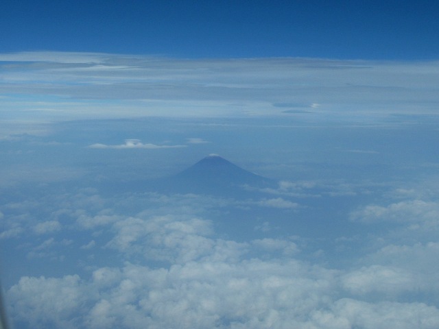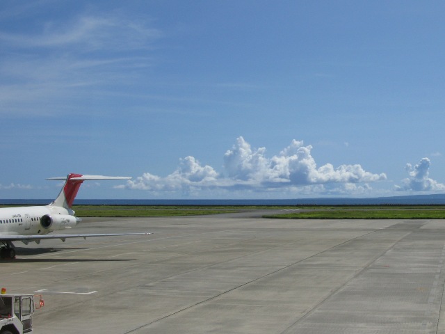 台風を心配していた一週間前 いよいよ出発の9月25日は晴 南の島へ出かける日になった。 島への定期便は到着1便 出発1便のみ。 飛行機の座席は右側 でも窓側ではない。 富士山見えるかなとつぶやいておいた。 と 窓側のおじさんが富士さん見えますよと教えてくれた。 小さく見えた富士山に多に興奮してしまう。 到着した飛行場 日差しは強く、空はどこまでも青く広がっている。