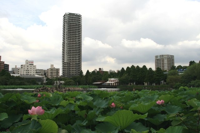 Cビルに囲まれた広い不忍池の蓮