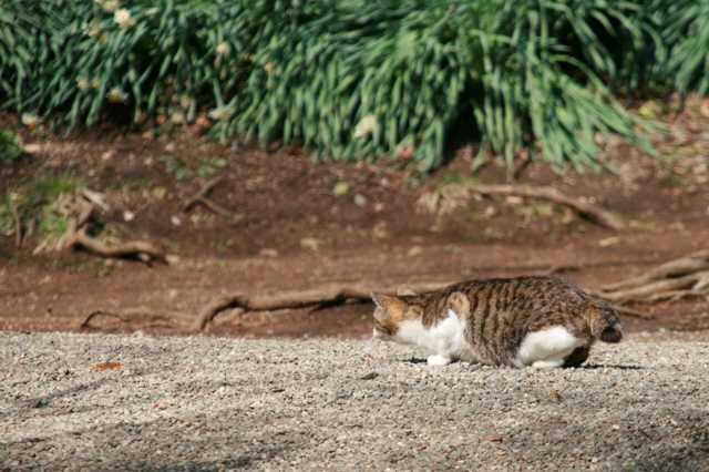 Cぽかぽか陽気に誘われて野良猫ちゃん、ちょうちょ(前方)を狙っていたがゲットならず残念でした。