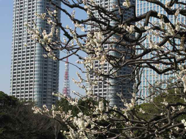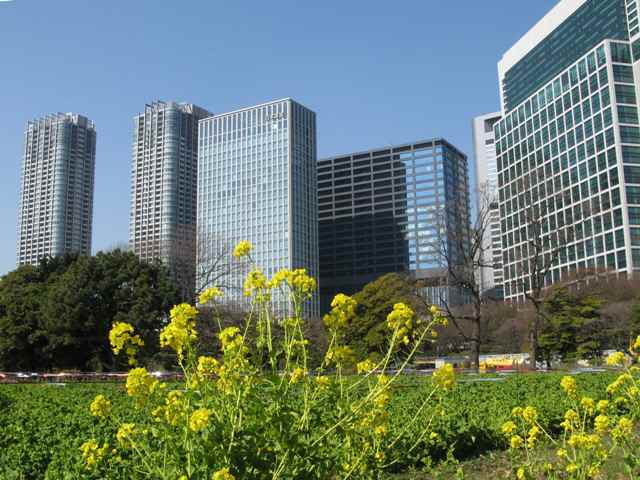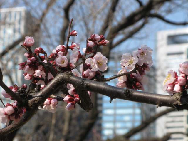 ビルの下にさく豊後うめ、菜の花(一部)どこにあっても美しさに変わりはなくホッとする空間を感じました。