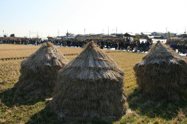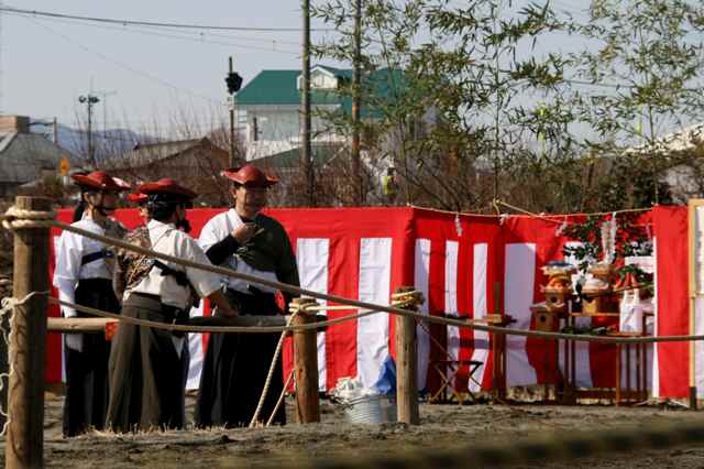 御殿場線下曽我駅付近の線路沿いに流鏑馬の舞台が見えていた。