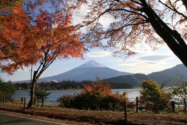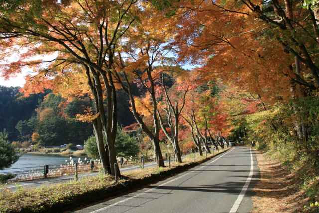 西湖湖岸を通って河口湖へ 野鳥公園もよる予定が見逃してしまった。 昨年も行った紅葉トンネルを歩いてみた。 相変わらずカメラを構えている人が多かった。