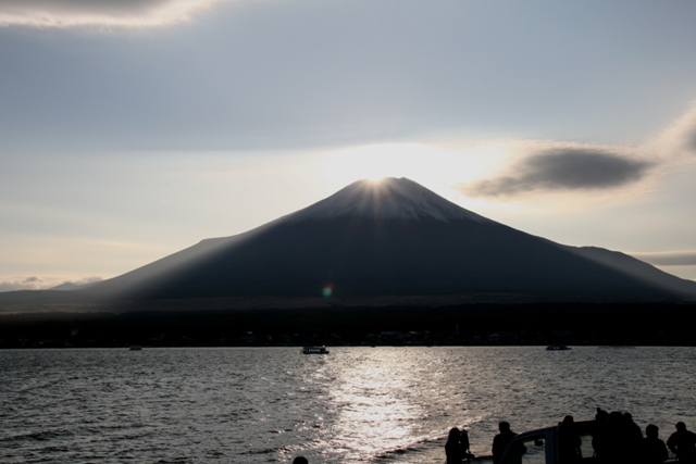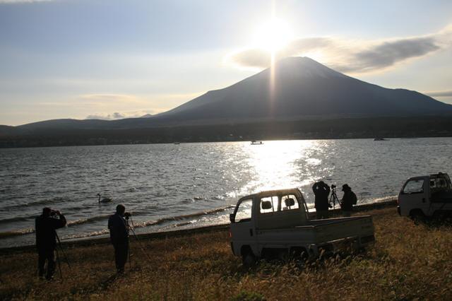 河口湖からといえば山中湖を通らない訳には行かない。 山中湖明神前を左折して青い空をバックにした富士山と湖を眺めながらドライブする事にした。 途中湖岸にカメラを並べた軍団に出会った。 私も興味津々遊歩道に降りてみる。 なんとダイヤモンド富士の時間だったのだ。 私もと試してみるがお日様が全く写らない。 美しく見かけるダイヤモンド富士の画像、すばらしい作品なんだと再確認した。