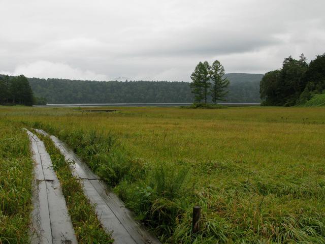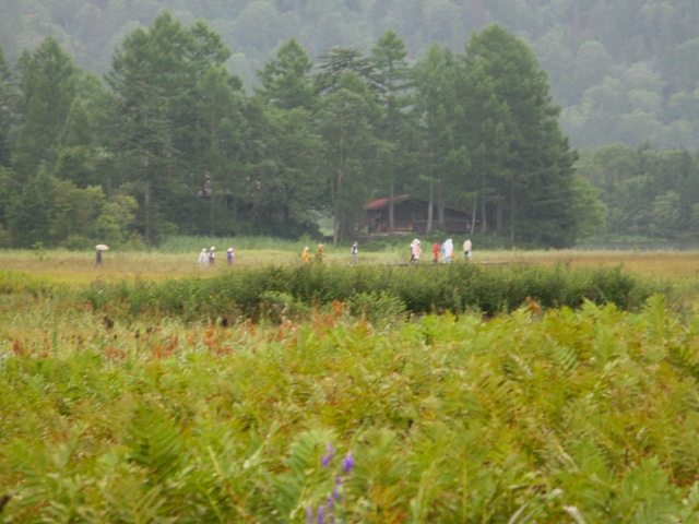 歩き出すとすぐ雨が降り出す、傘をさして大江湿原から尾瀬沼へ