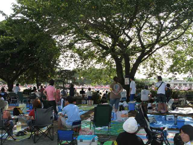 日陰を求めて桜の木の下の駐車場にもシートが広げられた。