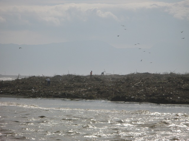 大磯側の浜辺は漂流物であふれ、なにやら人影も見られる。