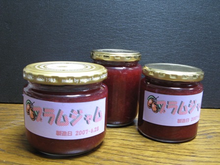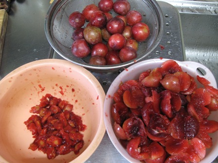友人宅の庭に実ったプラムをいただいた。 2,5キロもあったのでジャムに挑戦 1.実から種を穿り出す 2.種を火にかけてついている実をはがす 3.実は皮とともに火にかけあくを取りながら煮る 4.皮が柔らかくなったところで大雑把に漉す 5.種からとった汁と実に砂糖(全体の半量ぐらい)、 レモン(一個分)を入れて30分ぐらい煮る 6.出来上がりはちょっと酸味、渋みも残っている 見栄えはまあまあ、これでよしとしよう