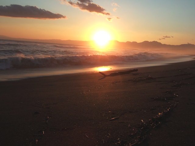 荒れる海と夕日を見ながら