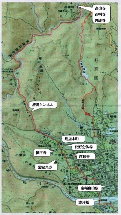 私の清滝川渓流ハイキングは終わりにちかづきます。 昔は鉄道が走っていたというトンネル道が見えてきました。 「トンネルを越えて右へ行きはりますと鳥居本の町並からあだしのどす」 はっきりと覚えていないが京言葉が耳に新鮮に聞こえた。 やはり京都の女性が話す言葉はやさしく聞こえる。