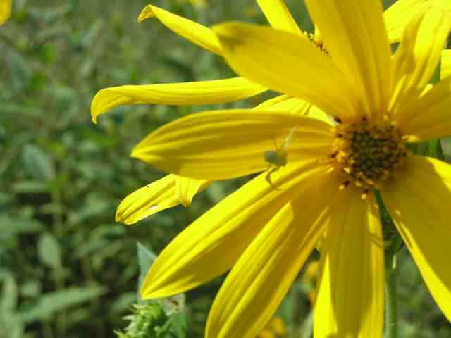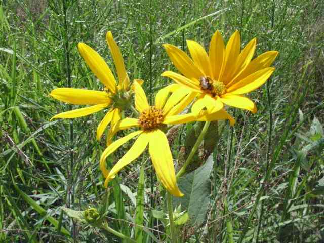朝の空気がすがすがしい感じがするようになりました 草原の中にちょっと小ぶりのひまわり色した花が目に入った この花は遠い昔、ふるさとの裏庭で見た事があると思い出します 早速パソコンで検索 対生に葉がつくのがイヌキクイモ、互生なのがキクイモとあった とにかく夏の暑い日ざしに良く似合う花です そしてまた散歩を楽しませてくれました
