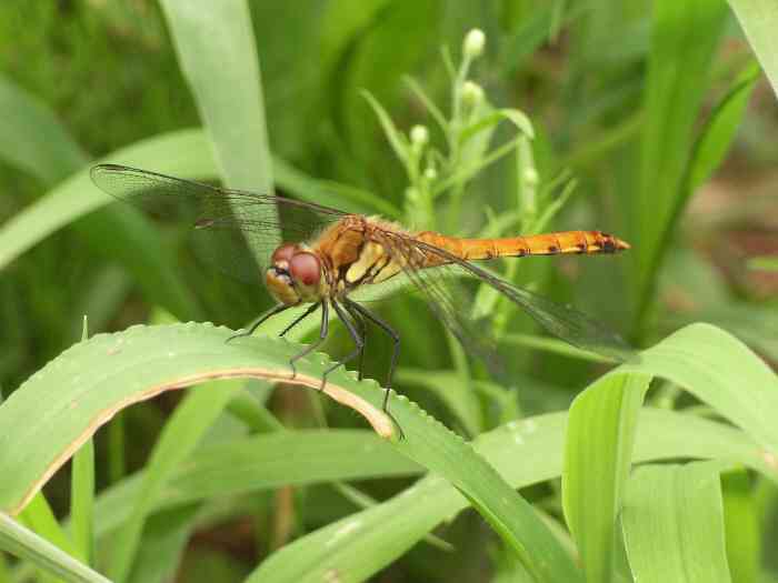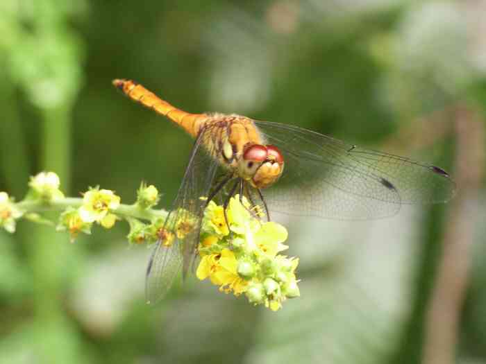里山を散歩しているとあっちこちにトンボがすいすい飛んでいるここのトンボは近づいても飛んでいかないキンミズヒキの花にとまっているトンボは羽を斜めにして明らかに身構えているようには見える。