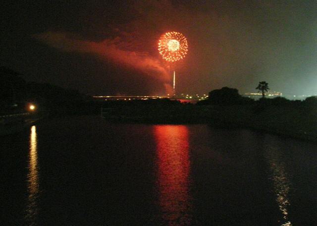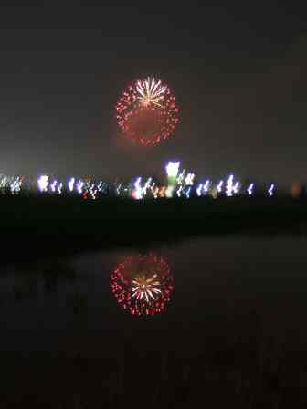 光化学スモッグ注意の広報がされると言うのに約束で海老名で家族が揃った。厚木鮎祭りの花火大会を見るために・・・夕飯をご馳走になり、さて川原へ、孫と遊びながらデジカメ撮影。そして早めの帰り道、なんと海老名駅近くへ着くと休耕田に花火が映っている。しかしこんな結果になっていようとは。設定ミスでした。でも心に残る画像なんです。