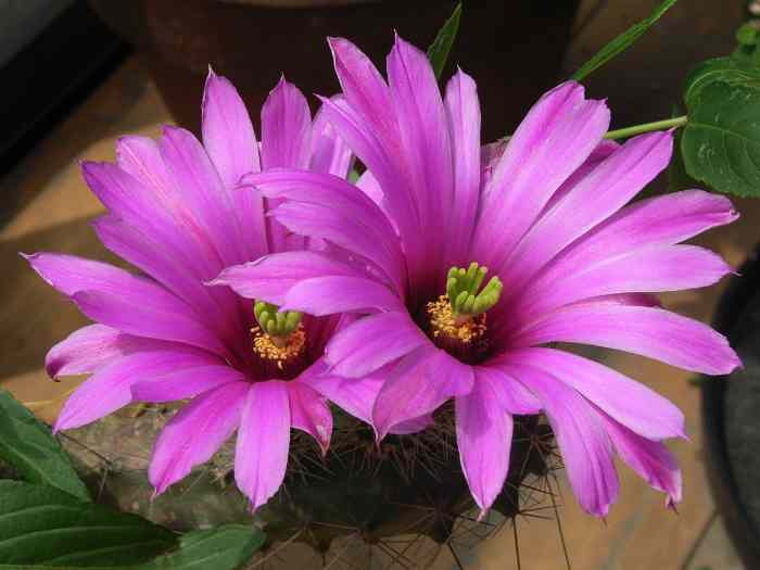 6/28写 孔雀サボテン、シャコバサボテン、月下美人 多肉植物系、とげのある花はどうしてきれいな花を咲かせるのだろう。 我が家にあるのはとても小さいが細かいとげで身を守っている左の花 も一つは8ミリぐらいの鋭いとげで他を寄せつけない右の花 双方とも毎年この時期に咲いてくれるのに名前がわからない。