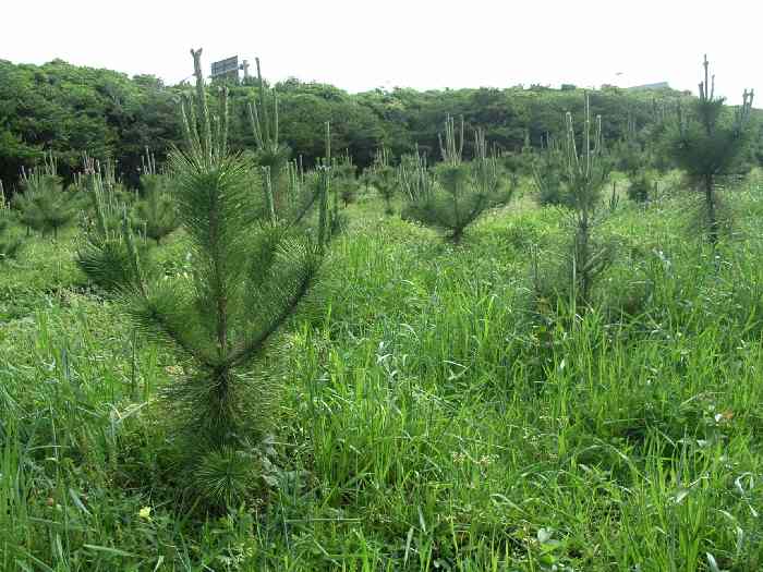 昨日の朝の海岸の青空 植樹された松の木 その傍らに見慣れない花が