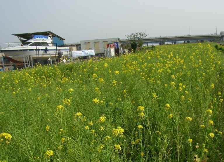 橋よりには菜の花畑が黄色い絨毯を敷いたように咲いています。
