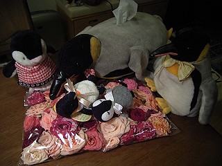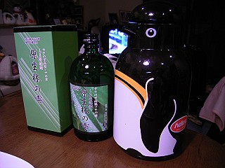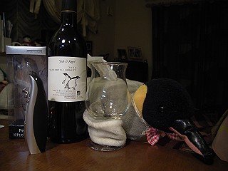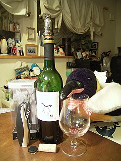<写真はペンギンワイン> 上:早く開けろとせがむティッシュくん 中上:いっぱしにテイスティングをするティッシュくん 中下:おかわりを要求するティッシュくん 下:グラスに注いだところ 色もなかなか綺麗でした。 ペンギンキッチンツールで開栓して、 ペンギンボトルキーパーで栓をしました。 12月2日に購入したのに開けたのは2月1日でした。 さ〜て、飲み終わった瓶は何処へ飾ろうかな〜っ。 |