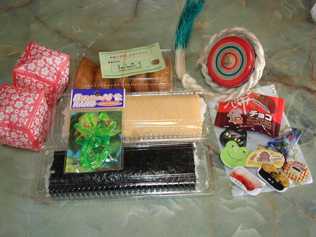 写真は「太巻き・卵巻・いなり寿司」と「100円分の駄菓子」