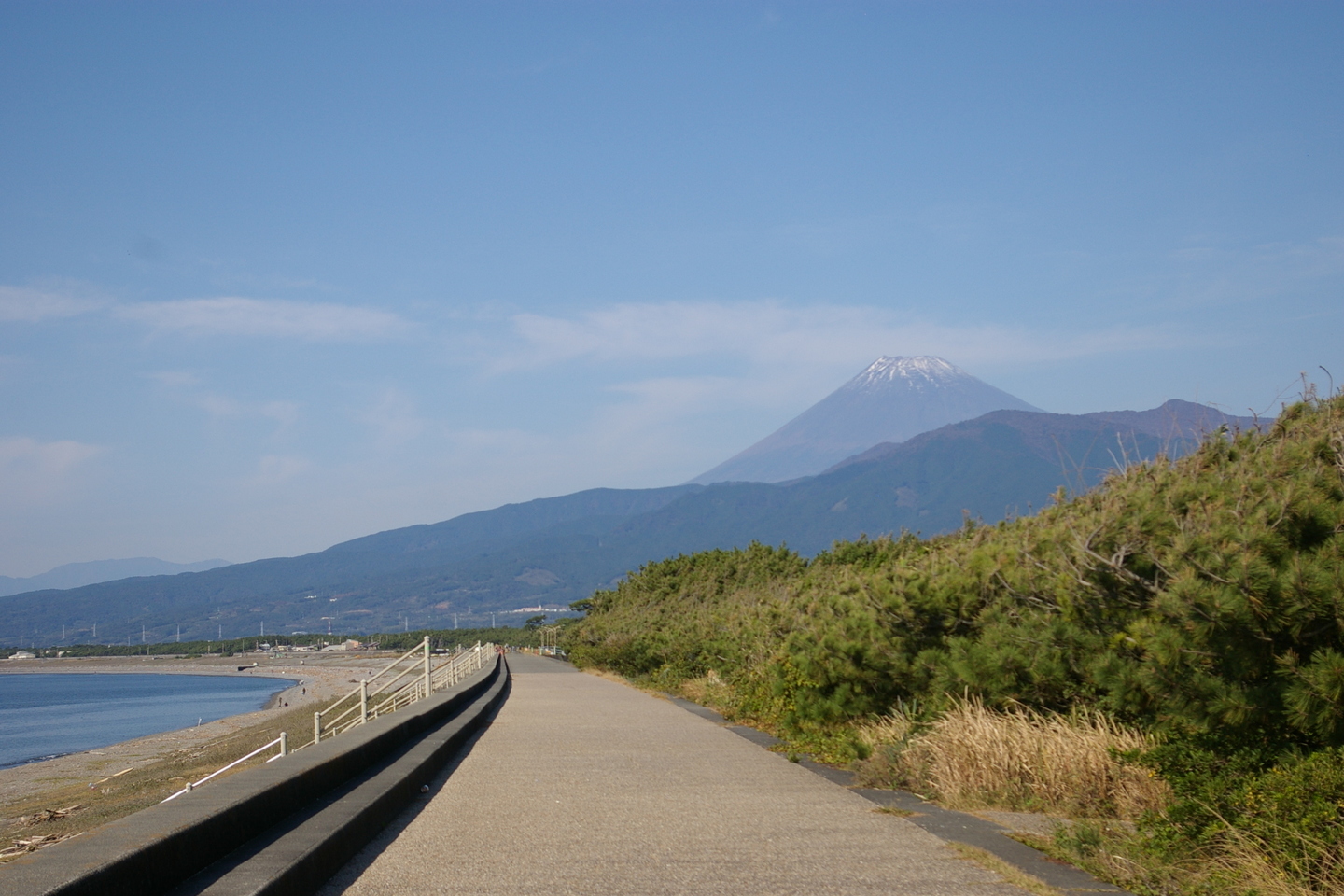 初日は、富士山が雲の上にチョット顔を出す程度でしたが、二日目は雲一つない青空で、沼津港から千本松原に向かって、海岸線を歩きました。