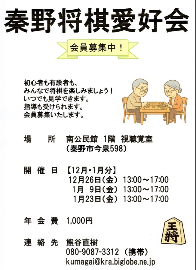 湘南棋友会は毎年2回、公民館対抗の将棋大会が行われています。 大会は平塚市4つ、伊勢原市1つ、寒川町1つの合計6公民館の将棋団体が集まって実施されます。 会場の設置や運営を行う公民館は当番制で、どの公民館も3年に1度順番が廻って来ます。 各公民館の将棋団体にはそれぞれ10名〜30名の会員が所属しています。 その中から最低9名の代表選手を選び、5公民館を相手に1チーム当たり合計45対局をこなします。 毎回60名程度の人達が集まり、熱戦が繰り広げられています。 6つの公民館が纏まり、湘南棋友会を構成しています。 日本将棋連盟平塚支部は湘南棋友会及び古河電工将棋部のメンバーが加わり構成されています。 長きに亘り続いてきた伝統有る公民館対抗戦を平塚市における大切な文化と捉え、側面からサポート出来ればと考えています。 市内の将棋団体が互いに協力し合い、平塚市、そして湘南地区における将棋文化の発展に寄与していける事を切に願っております