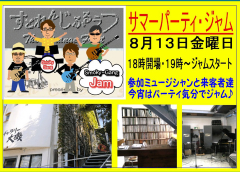 月例大磯すとれんじふるうつジャムセッションディだが、今回はSmoky-Gang&Jam単独の長時間ジャムとなる。19時から23時位までサマーパーティジャムとして盛上げたいので大勢の参加者を期待している。