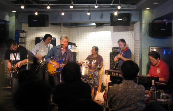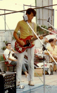 祭りの境内や盆踊りのヤグラでバンド演奏するのは懐かしいもの。中学生、高校生の頃は青春デンデケじゃないがよくやったものだ。歳を摂っても、お祭りは心躍るし子供心が甦るものだ。更に今回のステージは生まれ育った見付町との事。懐かしい気分♪見るより聞くより踊るものー♪ 七夕音頭は身に染み付いている♪ しかし、真昼間のお祭りの場にブルースは合わないと思うのだが。 ★戸塚憲吉&ブルースフレンズ★ 7月4日(土)平塚七夕祭り野外特設ステージにて昼間2時〜。 場所は、平塚市民センター裏の見付町広場。雨天中止との事。 湘南ひらつか七夕まつりのページ参照 http://www.city.hiratsuka.kanagawa.jp/tanabata/index.htm 右の写真は思い出の青春デンデケ時代のSmoky君だ。体重は今の約半分だったかな。幻の細身体型。 当時15歳、辻堂・地産ホテル・プールサイドのコンテスト。ここで戸塚さんのブルースバンド他、大人のバンドに勝抜き優勝してしまった。演奏した曲はグランドファンク・レイルロードのHeartbreakerとGot This Thing on The Move だったかな。当時はなかなか入手困難だったファズマスターが足元に見える。