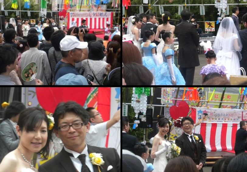 11時からのバンドメンバーの結婚イベントに間に合う様に大磯を午前10時前に夫婦で出かけた。あいにくの曇り空だが何とか天気はもちそうだ。 市営のパーキングは満車寸前でセーフ。早い時間にもかかわらず七夕会場は何処も大混雑。 11時になると新郎新婦11組がウェディングパレードとして商店街の竹飾りパールロードを練り歩く姿は、観客の多さもあったのか、何となく芸能人並みの人気で、テレビ局の取材カメラも回っている。 幸せそうな二人は大勢の祝福を受けながらセレモニー会場で結婚式を挙げた。本当におめでとう♪ たまたま同会場に居合わせたバンドメンバー夫妻とパイプラインのマスターと合流、店で内祝いの酒盛りとセッションになってしまった。 その後、新婚の二人は婚姻届を出しに出かけ、我々も解散。 28日のパイプライン・ライブは、彼らの結婚祝いを兼ねたものにしたいと考えている。 http://headlines.yahoo.co.jp/hl?a=20120708-00000009-kana-l14