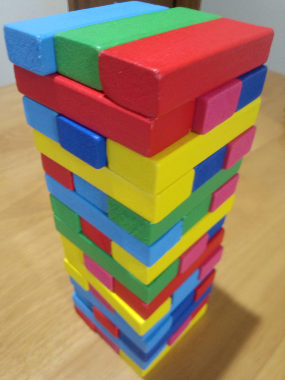 妹たちが持ち帰ったんだけど、サイコロで出たカラーを抜いて積むという、茶一色よりも難易度が高いもの。