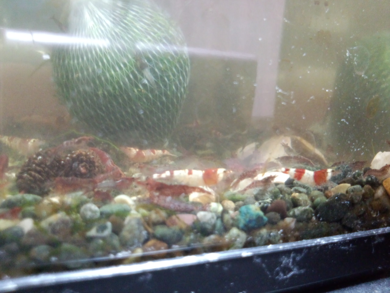エビちゃんはメイン水槽には入れずに、プラケースで単独飼い(ブルーラムズホーンだけは一緒)します。