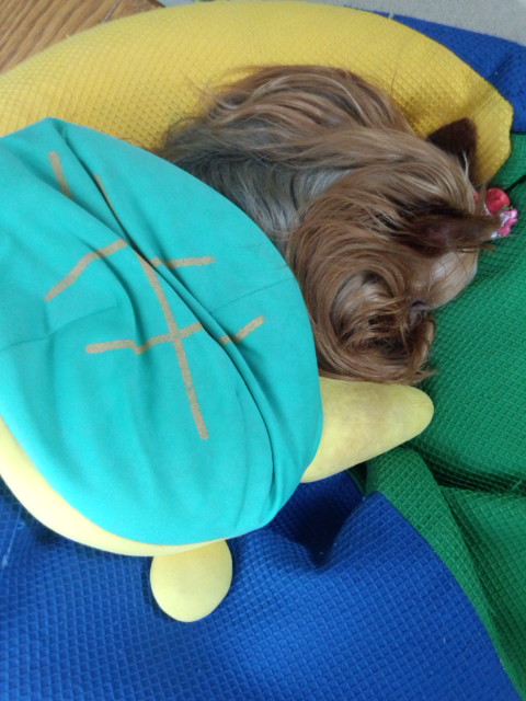 でも、日中、お互いに何となく寝不足気味な感じで、エルはサイコロクッションでカメ吉とスヤスヤ。