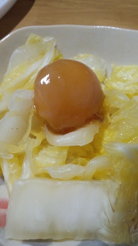 昨日仕込んだ黄身、白菜の浅漬けに乗ってます。
