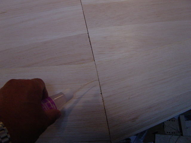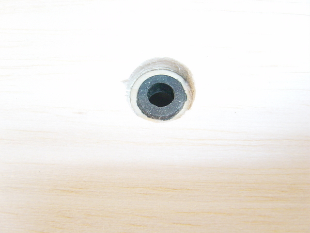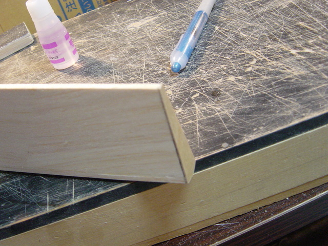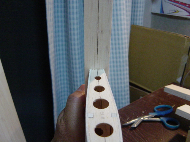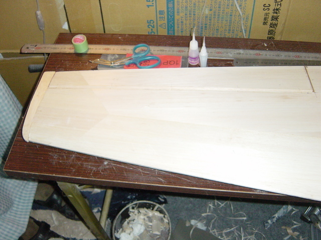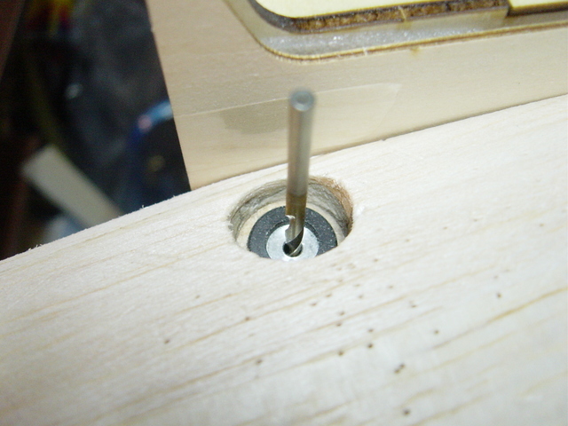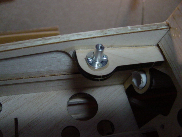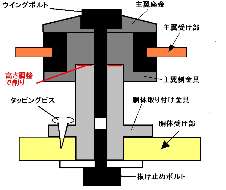 主翼の建て付けはちょっと厄介です。何しろ4本締めの取り付け構造は珍しいです。 先ずは、主翼の取り付けマウントにゴムのグロメットをはめ込みます。(写真1枚目) 胴体の主翼取り付け面に2mm程度の隙間(僕は2mmの隙間スポンジを置いた)を確保し主翼を乗せてアライメントを確認します。 プランビュー側は主翼両端と胴体尾部(ラダー取り付け面)の距離が同じになるようにセット。水平側は水平尾翼と主翼が水平になるか確認します。僕の場合は主、尾翼の水平は合っていたのでプランビュー側に集中しました。 アライメント調整時には、グロメットに入るカラーを取り付け、胴体側のウイングボルトのセンターの印しを、3mmドリルを刺して付けます(写真2枚目)。 この印し部分に胴体側の主翼取り付け金具用の穴をあけ(6.5mm)ます。僕は、7.0mmの馬鹿穴にしました。 取り付け金具4本を主翼にセットし(胴体側の取り付け金具も主翼に取り付け)、主翼を胴体にセットし(取り付け金具用に空けた穴に入れてセット)、胴体との迎角、プランビュウを確認します。僕は迎角が若干不足していたので(前側の胴体側の主翼取り付け金具用が若干長い状態)だったので、金具の頭を0.3mmほど削って合わせました。通常はそのまま使える設計なんでしょうが。調整が終わったら、そのまま主翼を外し、胴体側の主翼取り付け金具と胴体の受け穴部分にエポキシ接着剤を塗り、再度、主翼を調整時と同様に胴体にセットし接着剤の硬化を待ちます。接着剤が硬化したら、ウイングボルトを緩め主翼を外すと、胴体側の主翼取り付け金具は高さ、位置が合った状態で胴体に接着されました。付属のタッピングビスで固定し、裏側から3mmのキャップビスで抜け止めをして、完了。(写真3枚目) ちなみに、タッピングビスの役割はネジの回転方向の回り止めなので、設計上は4本締めになっていますが、1〜2本止めておけばOKの様です(プロエボオーナーのHND君曰く)。裏側からの3mmキャップビスの押さえは絶対忘れてはだめですよ。飛んでるとき主翼が剥がれまっせ。 主翼取り付け金具の大雑把な構成を説明します。(写真4枚目)