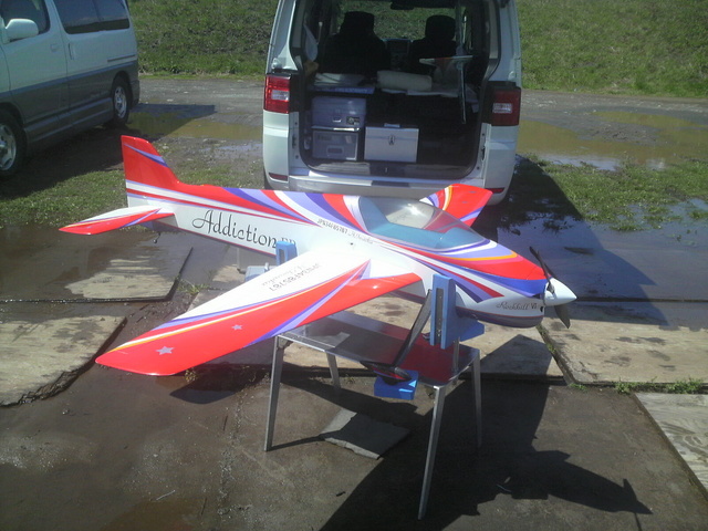 オークションに中古で出ていたので思わず落札。フルセットでした。 写真手前が僕ので、向こう側が いわいーぐるさん のです。 オーナー名は何と有名なHND氏、と思ったら、前オーナーがHND氏にプレゼントするために名入れしたらしいのですが、HND氏はもう機体を持っていたので不要になっていたとか、要らないって言ったとか、まあ定かでは有りませんが取りあえず僕の手元に。 飛行のインプレッションですが、カナライザーは嫌いなので無しで飛行。 かなりの強風での初飛行でしたが、ベリーパンのフィンが利いているのか、レールの上を走っているようにガシッと直線が出ます。 かといって全く動かないかと言うと、打てば利く、ラダーも良く利きヨー方向の向きが変えやすい感じです。主翼の後退が少ないためでしょうか。以前のグランドスラム等ではヨー方向が動き過ぎてコントロールしきれなかった記憶がありますが、ヨーの動き易さの良さと安定性の良さを併せ持った感があります。 Ariesに比べて若干速度コントロールが難しいかな、若干走り気味で少しパワーを殺すと速度落ちすぎと言った具合で良い所の速度コントロールはちょっと慣れが必要でした。 Ariesを壊してしまった後、急遽ブルーマックスの検定会に本機で出場して練習不足にも関わらず、MD取得となりました。トータルバランスは非常によい機体です。ちなみに大学の先輩のSZKさんも本機だそうです。結構気に入っているみたい。昔、ラジ技にSZKさんのクールビューティーって機体がのっていましたが、あれはスーパーショットがベースだそうです。
