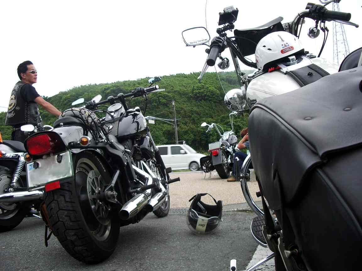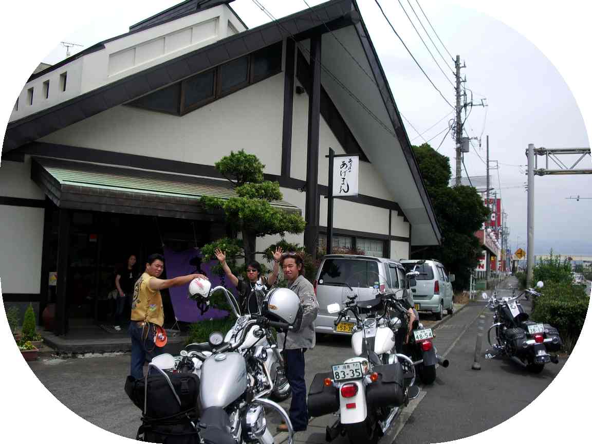相模湖ICから軽井沢方面に向けIN 最初の休憩地の談合坂SAへ、少しすると見たようなFLTRのペアが近寄ってきた、紛れも無く古畑君だった 偶然にもこんな所で・・・何処で誰に会うか分からないものです。 古畑ペアに別れを告げ一路次の休憩場所の双葉SAへ しかしながら雲が低い、案の定笹子トンネルを出たあたりからポツポツ落ちて来た、 仕方なく釈迦堂PAで雨具を纏い 急遽コース変更・変わり身は非常に素早い、甲府南ICでOUT、南に向けR52で富士川沿いを走る 正解で雨雲は無くなった、途端に蒸し暑い状況に、熱い熱い 片平君のホームタウンの富沢道の駅で休憩 芝川・富士宮・富士経由で沼津から三島へ、一時半頃に昼食にあり付く、とにかく熱い・熱い・蒸し暑い、エンジンも大変だろ〜な〜、早く箱根に!箱根峠で生き返る。 全行程の距離、280キロ予備タンを使わずで、結構走れるジャン 着くなり一息ついた後にバイクの洗車でアカを落とす、これでOK 今度は自分がシャワーを浴びる、サッパリ・・・疲れた〜〜