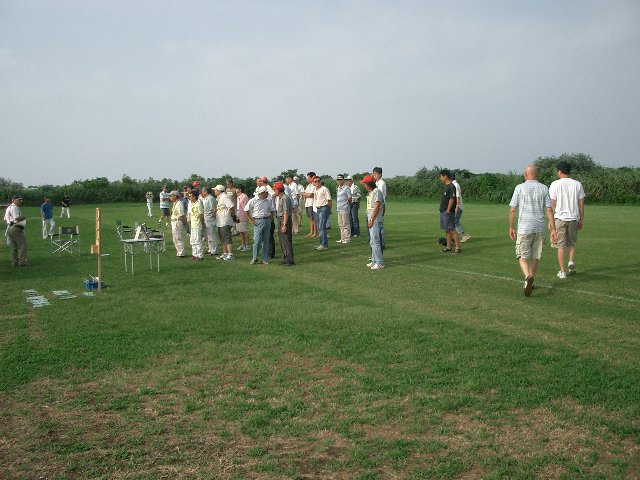 今年狙っていた検定会が8月10日富士川の河口フジエアロフレンズ・清水R/C飛行場で開催されました。 開会式の集合です。ぞろぞろと出場者が集まってきました。 このあと、式典の中で日本無線航空会の村山会長が6月27日永眠致したそうで全員で黙祷しご冥福を祈りました。