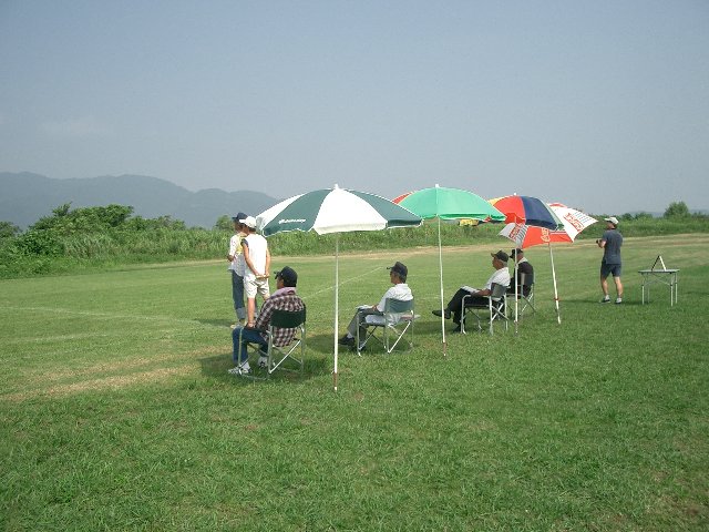 写真は飛行演技のジャッジ風景です。真夏の太陽が燦々と降り注ぐ中、皆さん汗だくで頑張っています。