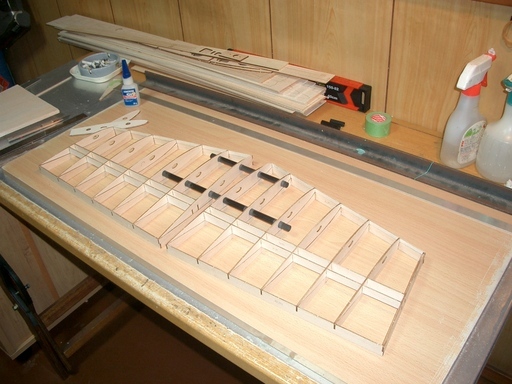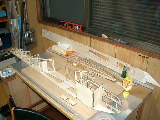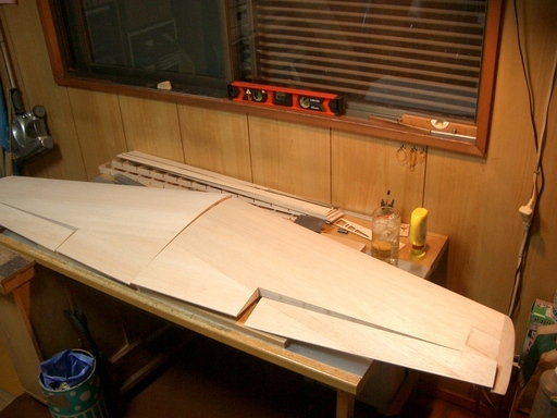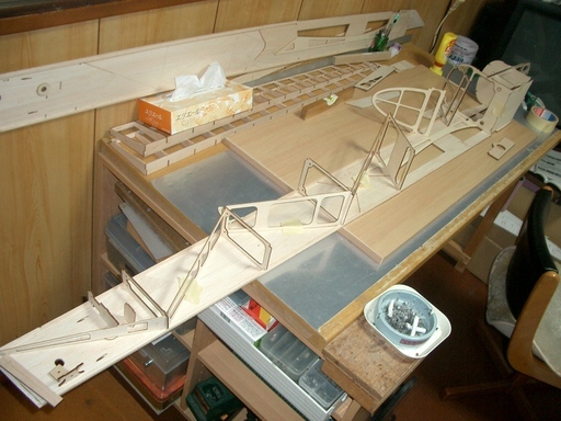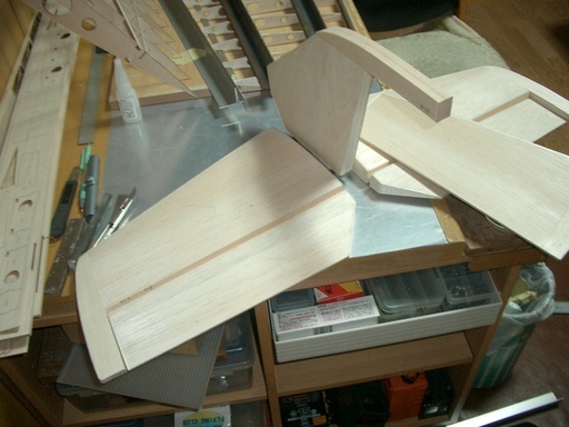 水平尾翼の荒整形、垂直尾翼の仮組、主翼リブの組立までこぎ着けました。
