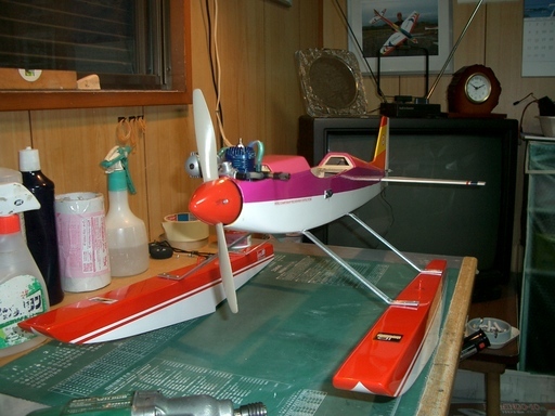 作り掛けのフロートも出来上がり、機体にセットする工程がきました。取り付け角は神経を使うところです。