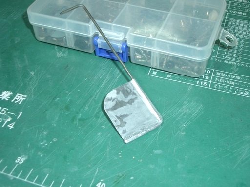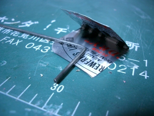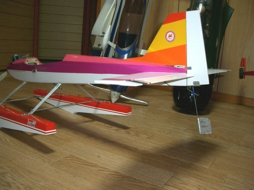フロートの取り付けもやっと完了し、水中舵を取り付けて水上機バージョンの完成です。 水中舵の製作は1.6oのピアノ線と缶ビールのアルミ板を使いました。一枚ではさすがにペコペコなのでピアノ線を挟むように二枚重ねとします。