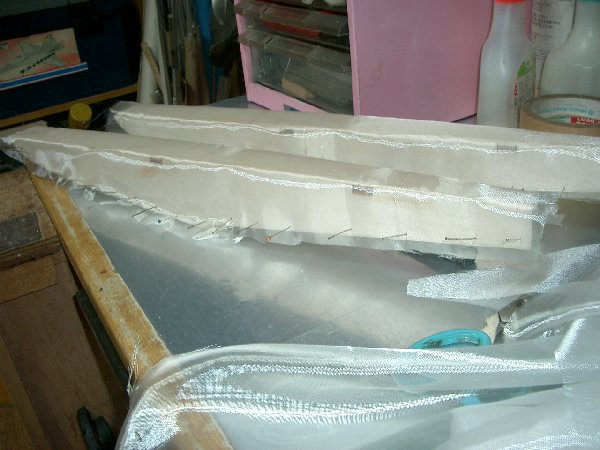 ←ガラスクロスを被せ虫ピンで仮に固定し、FRP塗料を塗る準備。