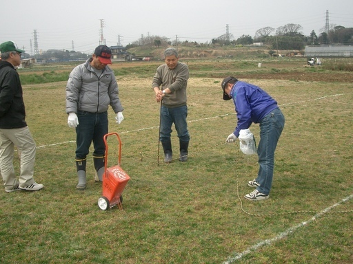 写真上;大会の準備で線引きをする仲間達。