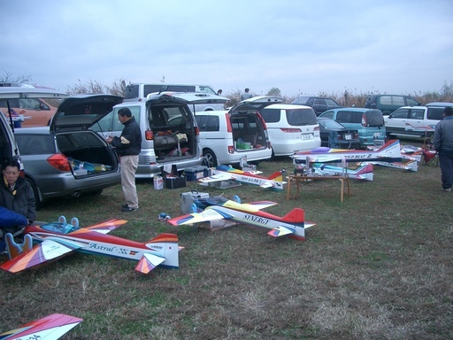 今回は66名の飛行機野郎が集い、意気揚々と合格を願って参加しましたが、生憎の雨で過半数(ゼッケン37番)を飛ばした頃、安全を考慮し中断。(何とも煮え切らない。今日の日の為にいろんな事して頑張って来たのに!)私の出番はゼッケン55番!空を睨んでも出番が来るまで2時間は掛かるし、天気は下り坂だし、アキラメルベシ。(クソ〜ッ!!)