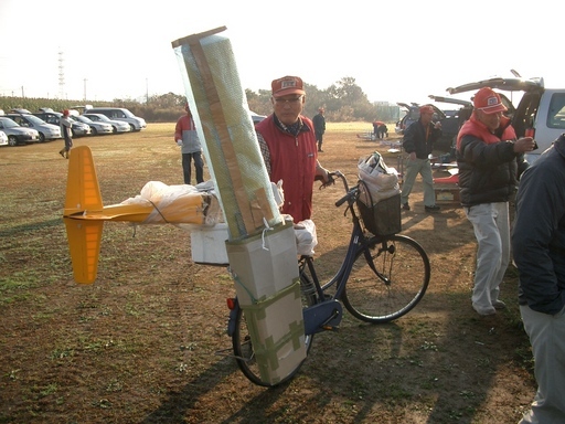 昨日の続きです。 【左上】クラブの長老”大ヒコジジイ”登場です。(ヒコ爺の親父ではありません!!)自転車に愛機を積んで天気が良いと出掛けてきます。戦時中はパイロットとか。若者が自転車や原チャリの横にサーフィンボード付けて走ってるの見かけますが、自転車に飛行機付けてるのこの爺さんだけ。(ヒコ爺の将来?)伊勢原で見掛けたら声を掛けてあげてください。