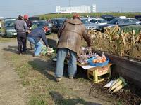 【右下】これもご奉仕?? 近隣の家庭菜園の方の農産物の即売会です。 無農薬の野菜を格安で分けて頂き、奥様にがまスリ! ダイコン、里芋、ネギ、黒豆、柿、何とか菜?と100円〜。 晩ご飯はみんな”鍋”かもね。