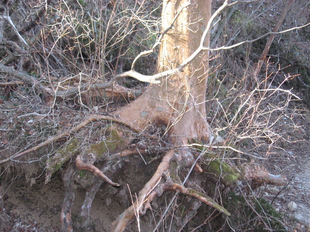 木の根の下がえぐれて倒木となる
