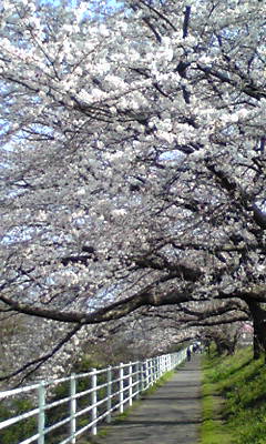 河内川土手の桜並木の中に一本だけ